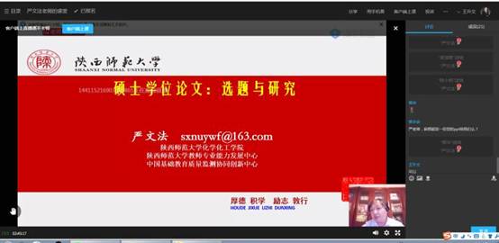6月16日,应化学与化工学院的邀请,陕西师范大学副教授,硕士生导师,中国基础教育质量监测协同创新中心陕西师范大学分中心副研究员,陕西省中小学幼儿园教师培训首批专家严文法老师以线上腾讯课堂的方式为化工学院师生做了题为《硕士学位论文:选题与研究》的学术报告。报告会由化工学院王升文副教授主持,化工学院相关教师、研究生和部分化学专业本科生聆听了此次报告。