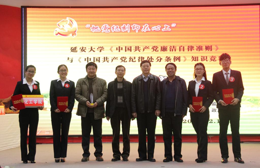 2015年12月15日晚七点,由校纪委主办的《准则》和《条例》知识竞赛在大学生活动中心举行。参加本次竞赛决赛的4个队伍医学院、经管学院、文学院、化工学院都是由先前笔试而选拔出的优秀队伍。我院由党委书记舒永安老师带队组织,由申圆圆老师,王田田、刘咪、王洋三位同学代表化工学院参赛。出席本次竞赛活动的有延安大学校长张金锁、纪委书记王顺、总会计师范育琳以及各个学院的领导和部分学生。