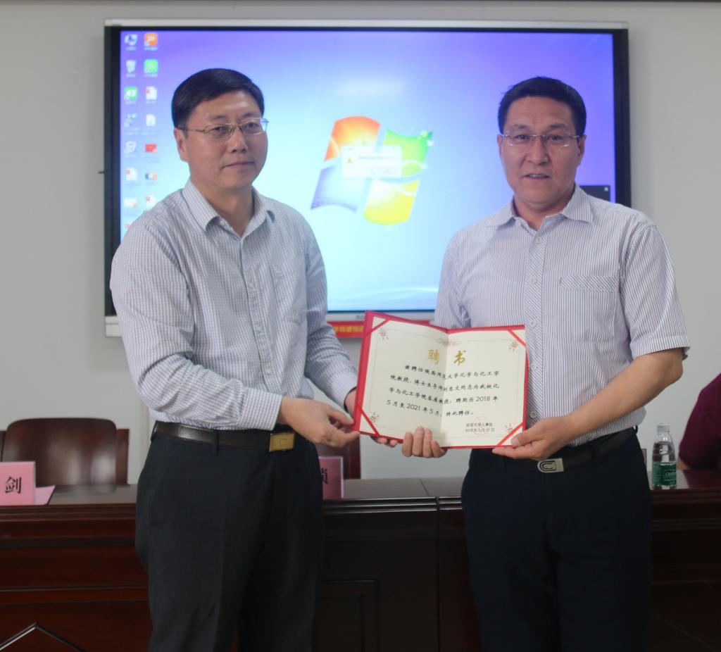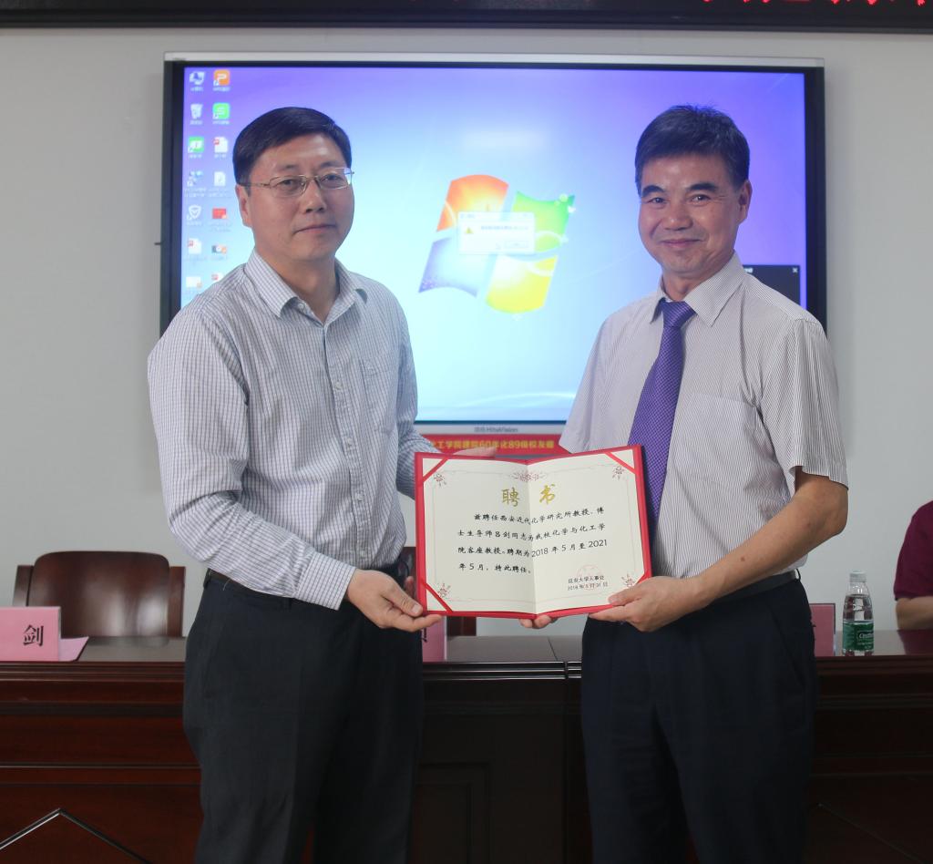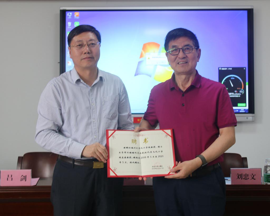 刘小淼处长宣读了英国威廉集团官网聘请吕剑、王绪绪、刘忠文教授为化工学院客座教授的文件,张校长为三位教授颁发了证书。