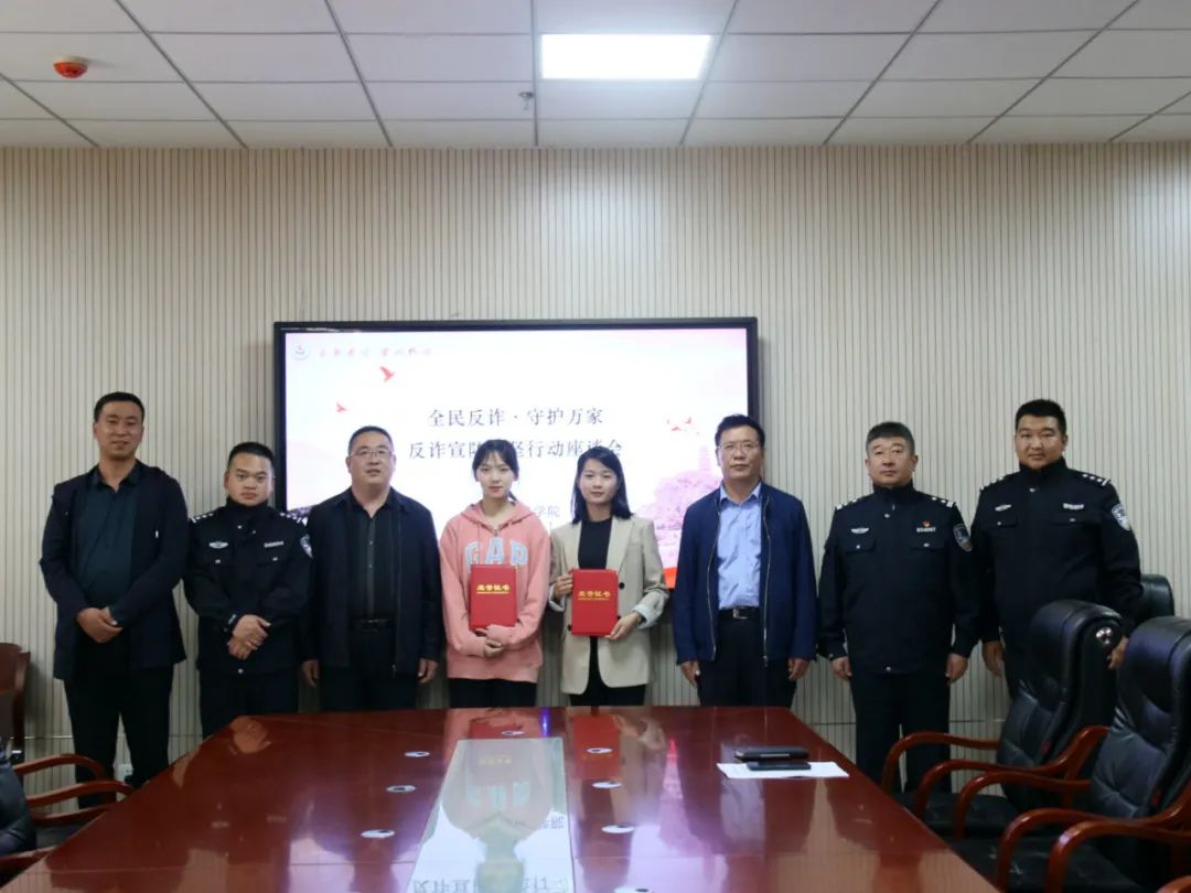 座谈会上,折翔首先对反诈小程序进行简单介绍,先后对反诈APP,火眼预警的成绩表示肯定,同时也强调了同学们身边所存在的反诈隐患。高勇通过一系列数字、案件跟同学们进行分享。高军为反诈工作有突出贡献的刘咪老师,窦乐同学颁发“反诈工作先进工作者”证书并与之合影留念。赵芝瑞与高勇签订反诈责任书。通过警、校合作加强反诈宣传,切实保障同学们的利益。