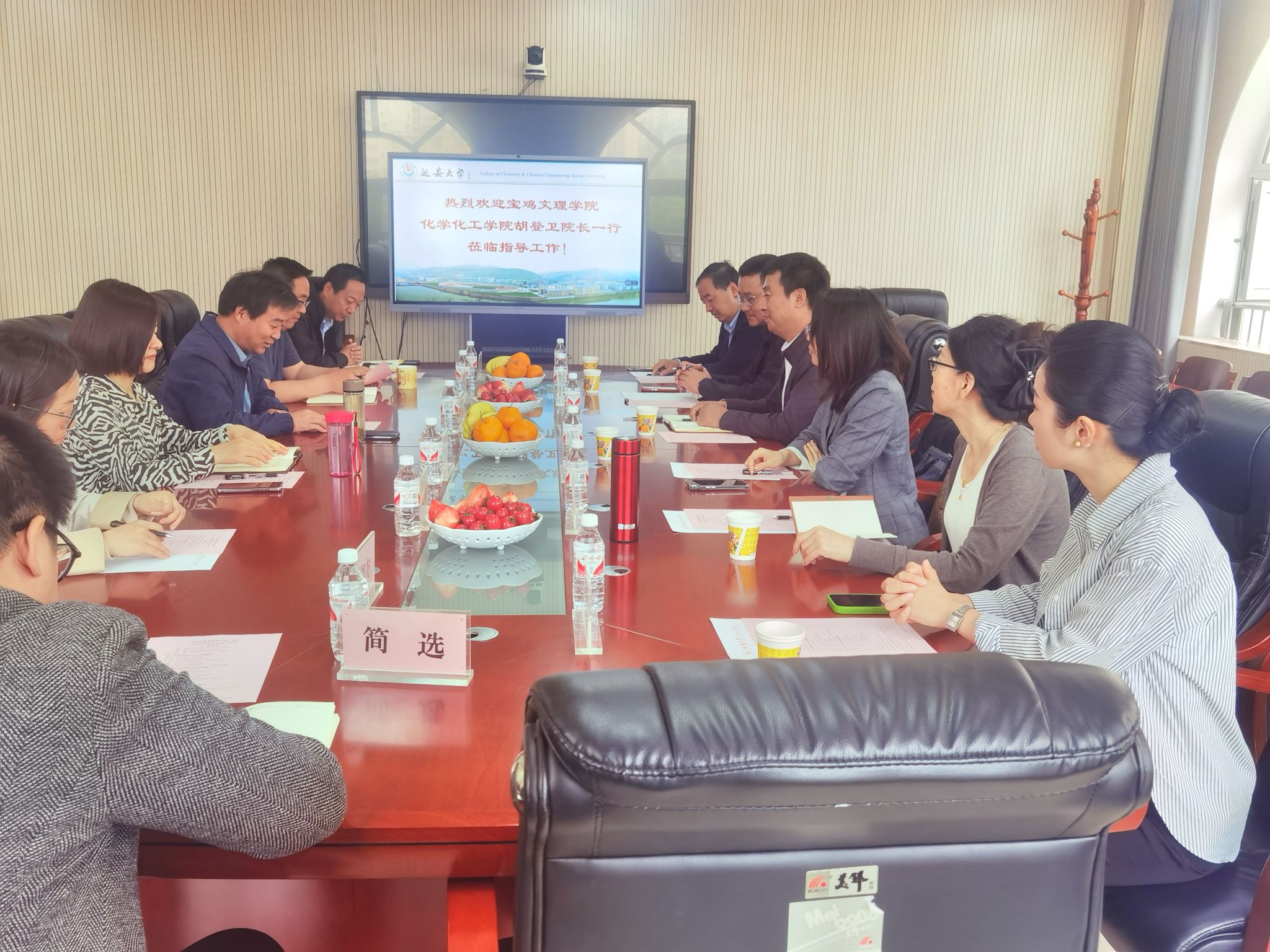 5月9日上午,宝鸡文理学院化学化工学院胡登卫院长一行6人来我院考察。院长张琰图、院党委副书记赵芝瑞、教学副院长王潇及学院部分教师代表在化工大楼215会议室与胡登卫院长一行6人进行座谈交流。
