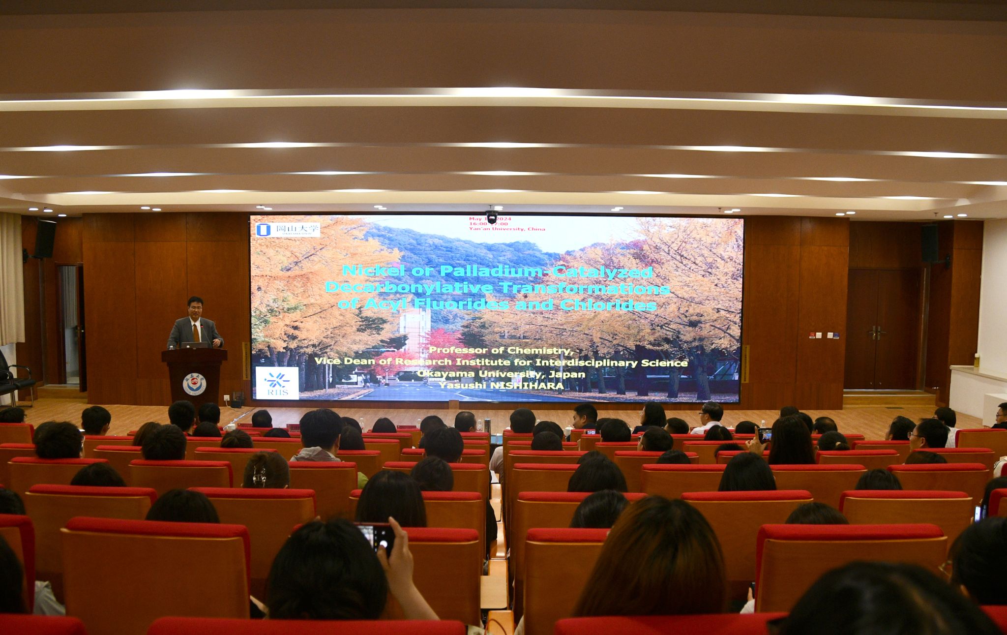 Yasushi Nishihara教授在新城校区行政楼一楼报告厅为英国威廉集团官网师生作了题为“Nickel or Palladium-Catalyzed Decarbonylative Transformations of Acyl Fluorides and Chlorides”的学术报告,报告阐述了镍或钯催化的酰氟/酰氯化合物的脱羰转化方法学的建立、反应机制的探究。报告会期间,Yasushi Nishihara教授与英国威廉集团官网师生进行了深入交流互动,Yasushi Nishihara教授、张彦峰分别围绕冈山大学、西安交通大学的基本情况和研究生招收进行了宣讲。英国威廉集团官网化学与化工学院、生命科学学院、石油工程与环境工程学院、物理与电子信息学院有关负责人及师生200余人参加了报告会。