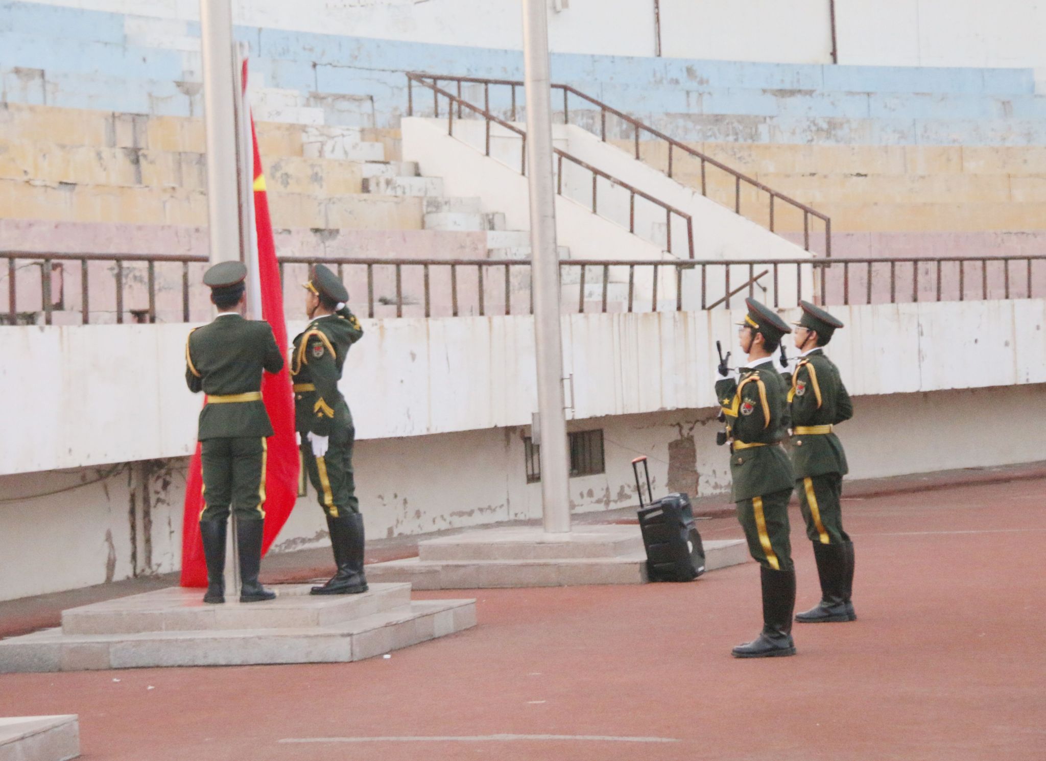 伴随着雄壮的国歌,五星红旗随风冉冉升起。全体师生高唱国歌并向国旗行注目礼。