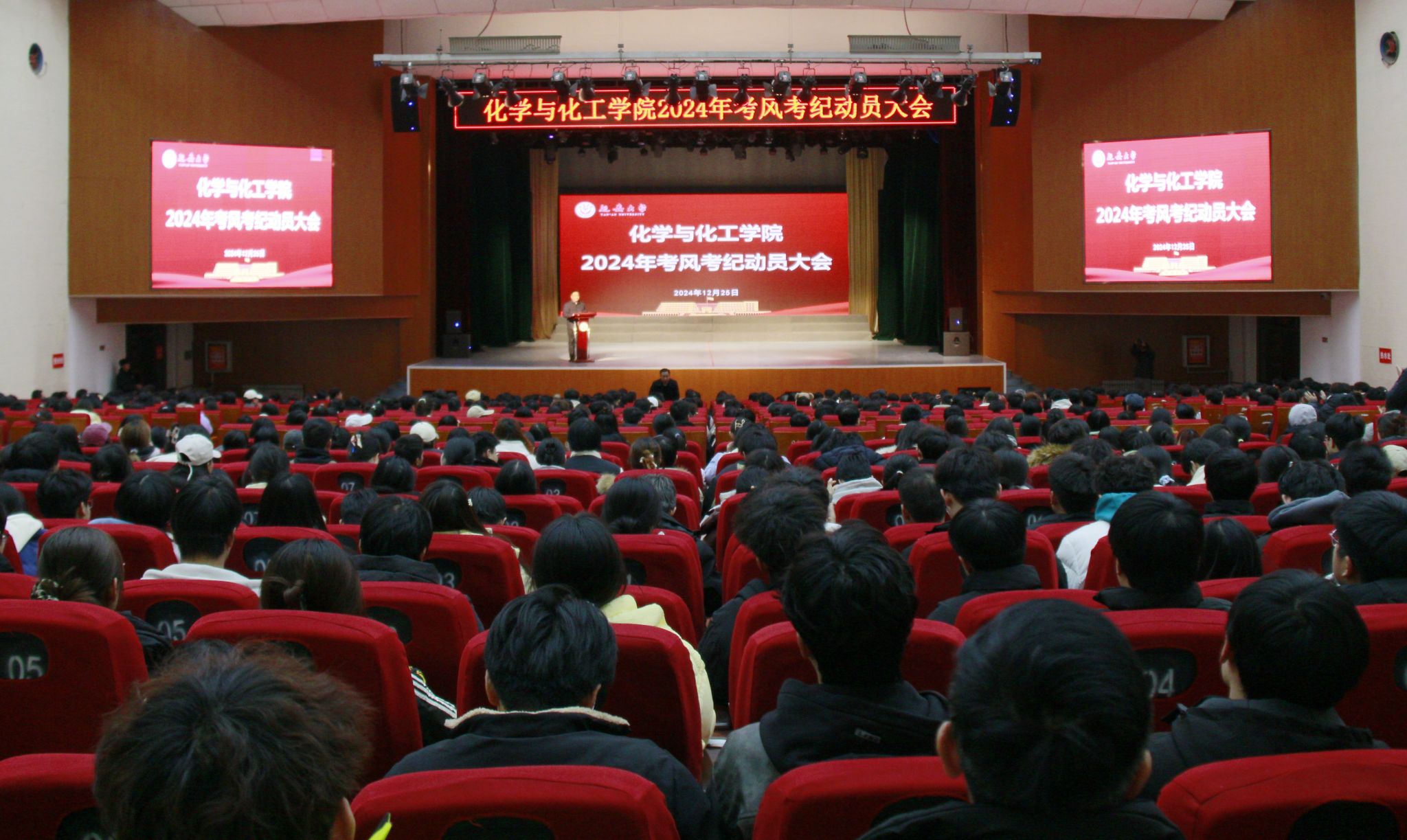 为进一步规范考试纪律,营造良好的考试氛围,加强学院学风建设,增强学生诚信自律意识。12月25日下午,化学与化工学院在杨家岭校区大礼堂举行2024年考风考纪动员大会。副校长付峰、学工部部长张翔、教务处副处长高生军,学院院长甄延忠、副院长王潇,全体教职工及800余名同学参加了本次大会。大会由院党委书记赵芝瑞主持。
