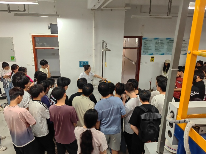 培训会后,为将理论知识转化为实践技能,实验员老师们带领全体学生走进实验室,开展化学灼伤应急处置和消防知识现场教学。实验员老师们详细介绍喷淋装置、洗眼器、消火栓、烟雾报警器等设施的位置与使用方法,还针对实验室易燃试剂储存、电气火灾隐患等特点,现场演示火灾应急疏散流程,确保每位同学都能在实战中掌握消防技能,为实验室安全再加一道防护锁。
