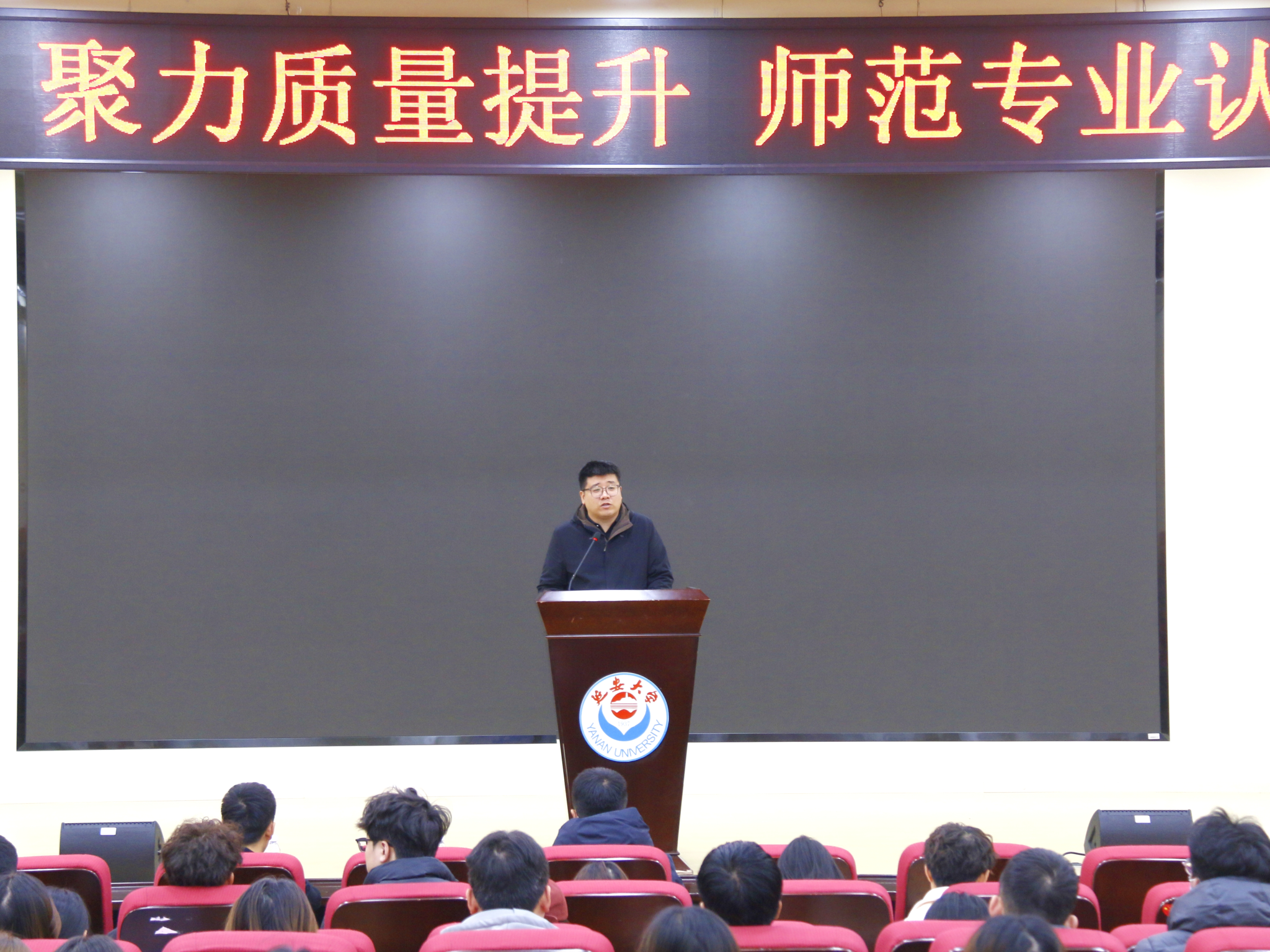 简选以“两个最”进一步强调本次认证的重要性:一是“最重要”,师范认证凝结学院七年艰辛筹备,关乎每位师生发展;二是“最关键”,当前认证已进入专家进校考察的关键阶段,需全院师生高度重视、协同努力。为此,学院专门编印《师范类专业认证知识手册》并下发至每位同学,要求大家深入学习、全面掌握认证相关内涵与要求。