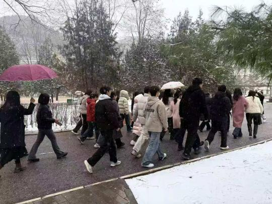 活动当天,延安降下2026年初春的第一场雪,杨家岭校区银装素裹,窑洞广场与校园步道覆着一层薄雪,空气清冽,景致素雅。尽管气温偏低、路面湿滑,全体教职工仍精神饱满、热情高涨,准时在窑洞广场集结。大家有序列队、整装待发,在工会工作人员的引导下,沿着规划路线稳健前行。