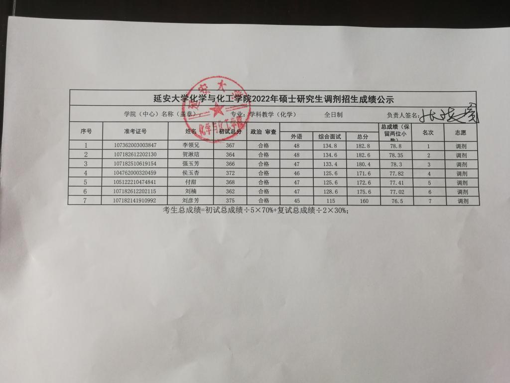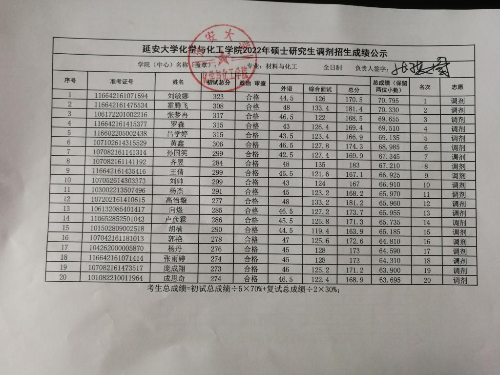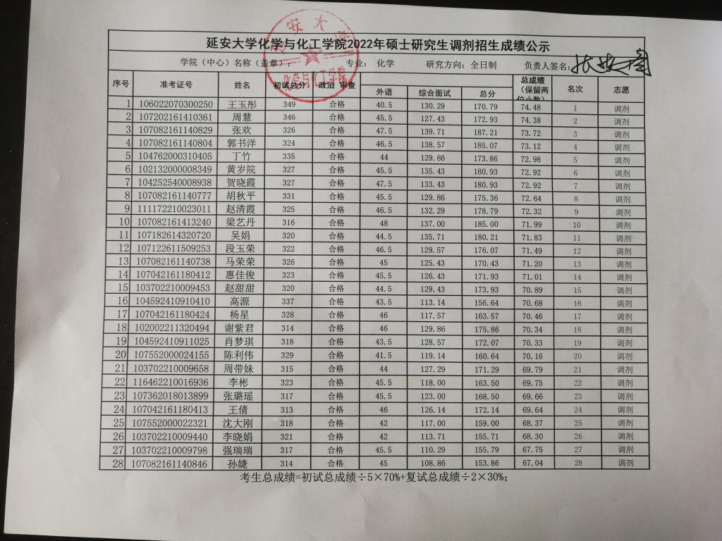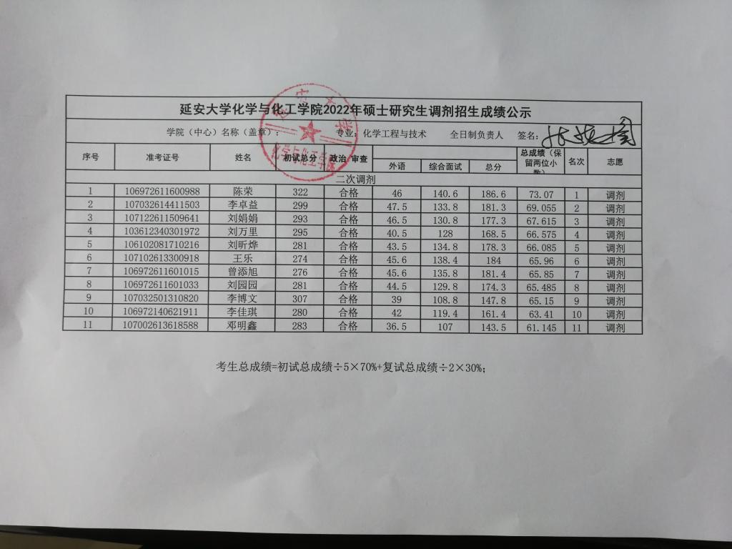 根据考生总成绩计算公式(考生总成绩=初试总成绩÷5×70%+复试总成绩÷2×30%),现予以公示我院各专业调剂招生成绩,如有异议请以书面形式报至我院。